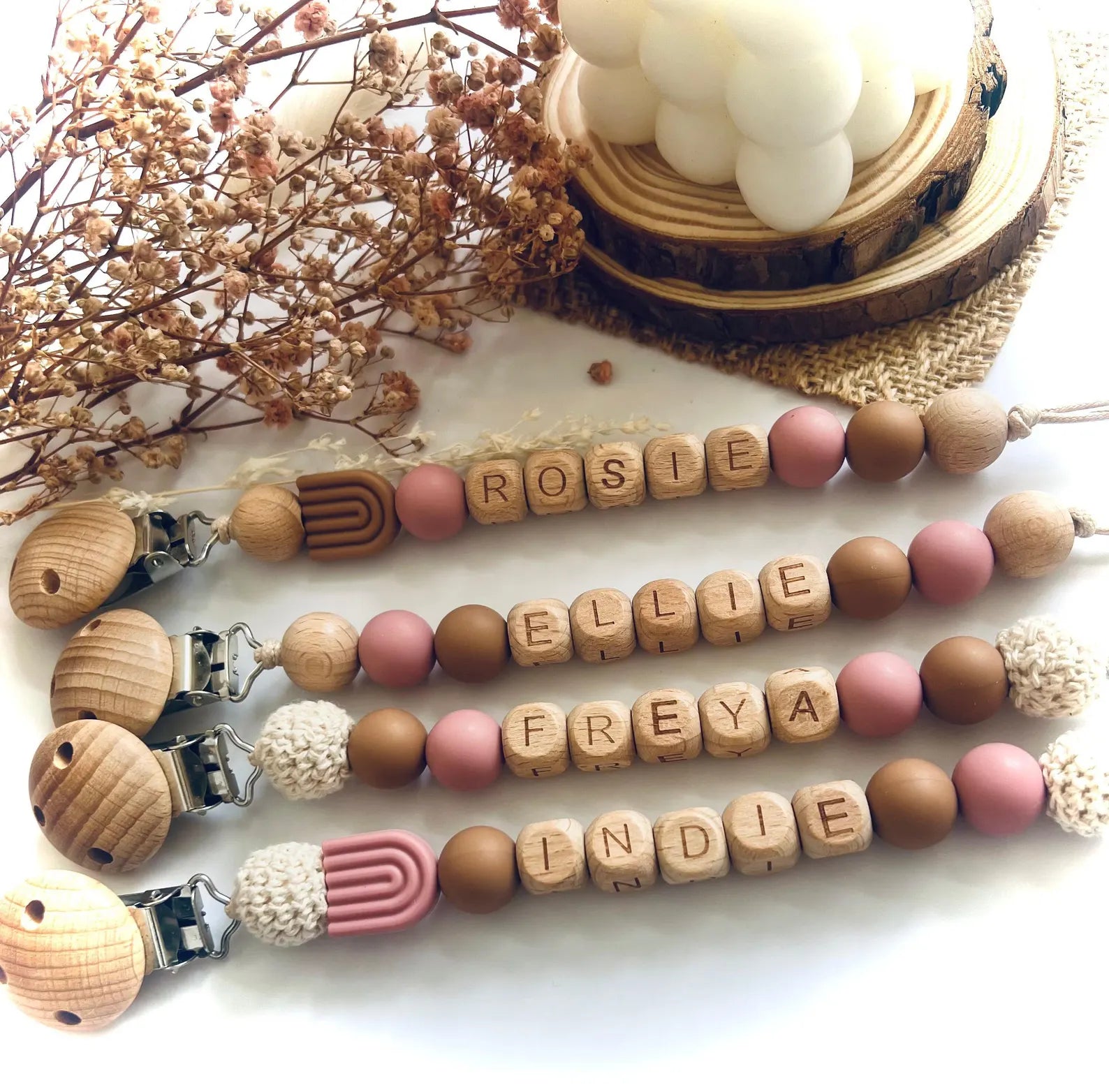 Keuze uit houten letterkralen of beige siliconen letterkralen