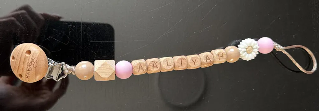 De ce fait, il est possible que pour les noms plus longs, le design soit légèrement adapté. Dans certains cas, moins de perles sont utilisées ou les couleurs sont légèrement ajustées ou interchangées, afin que l'attache-tétine reste dans la limite de sécurité maximale.